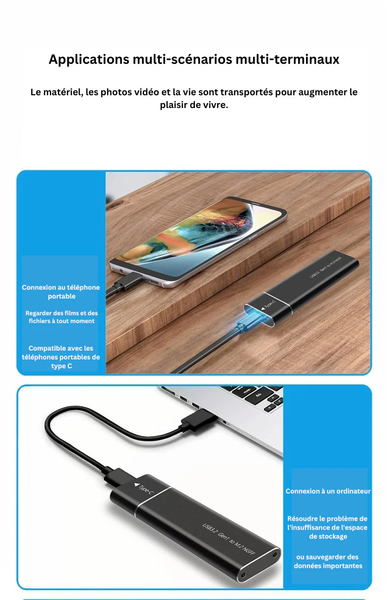 Offrez-vous une expérience de stockage haute vitesse avec notre SSD portable. Bénéficiant de vitesses de transfert époustouflantes, parfaites pour les professionnels du déplacement et les amateurs de technologie, il s'adapte à tous vos besoins de stockage, que ce soit pour vos fichiers personnels, vos photos, vos vidéos ou vos projets professionnels.