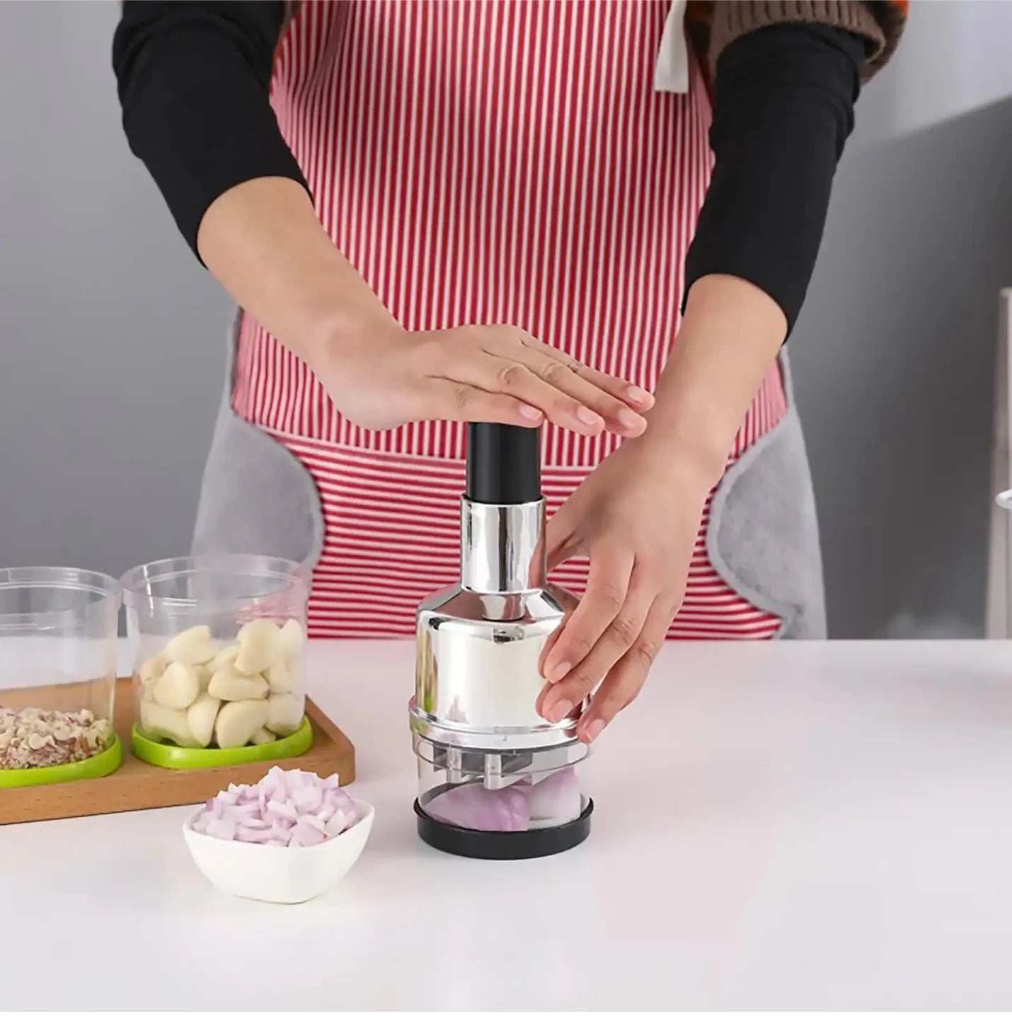 Zéro risque de blessure Ce hachoir est doté d'un poussoir souple pour plus de confort lorsque vous hachez de grandes quantités d'aliments. Il suffit d’exercer une légère pression sur le poussoir pour hacher rapidement l'ail et les oignons en quelques secondes, plus besoin de se blesser en touchant les lames. Nettoyage facile Le hachoir à légumes se démonte facilement pour un nettoyage rapide, il suffit de le nettoyer à l'eau courante en 2 minutes. Un seul outil pour une large utilisation Le hachoir est idéal pour la préparation d'aliments multiples comme les oignons, l'ail, les noix, la coriandre, les légumes, les petites salades, le thon, les oeufs durs et plus encore.